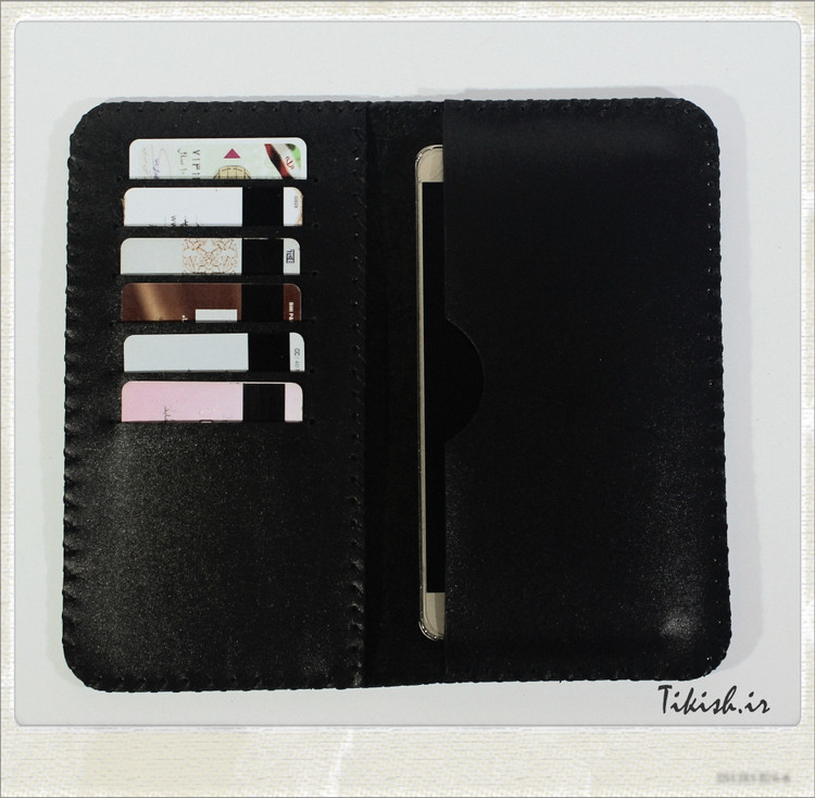 کیف پول و جا موبایل چرم تیکیش به رنگ مشکی مات تهیه شده از چرم طبیعی گاوی درجه یک. چرم طبیعی گاوی
