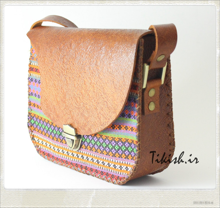 این کیف تنها دارای یک عدد بند بلند جهت قرار گرفتن کیف در کنار بدن و دارای یک سگک جهت اندازه کردن بند می باشد. همچنین در این کیف از تلفیق چرم و پارچه استفاده شده است. آستر داخلی این کیف پارچه ی طرح جاجیم میباشد.