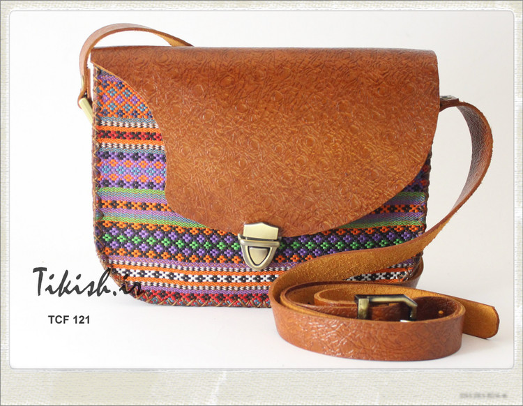 کیف یک طرفه چرمی تیکیش مدل TCF-121، بسیار سبک و مقاوم است که از چرم طبیعی گاوی قهوه ای طرح دار تهیه شده است. در ساخت این کیف از بهترین و مقاومترین برند نخ موم زده استفاده شده است. این کیف کاملا دست دوز بوده و طرح ساده و شیک این کیف که تلفیق پارچه ی طرح جاجیم و چرم طبیعی گاوی میباشد مناسب با سلیقه ی بانوان است . همچنین جهت حمل وسایل مورد نیاز کوچک شما یک جیب زیپ دار در پشت کیف تعبیه شده است.